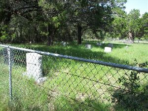 These two family Cemeteries are located on Britt Burns' property. To reach the site, turn left at the Wimberley Bank in downtown Wimberley onto River Road at junction of River Road and RR 12. Follow road for .7 mile. Turn right and go .1 mile farther to a Y in the road. The cemetery is in the yard of a large home with a peaked roof straight ahead of you at this point. You must seek permission before searching the area.