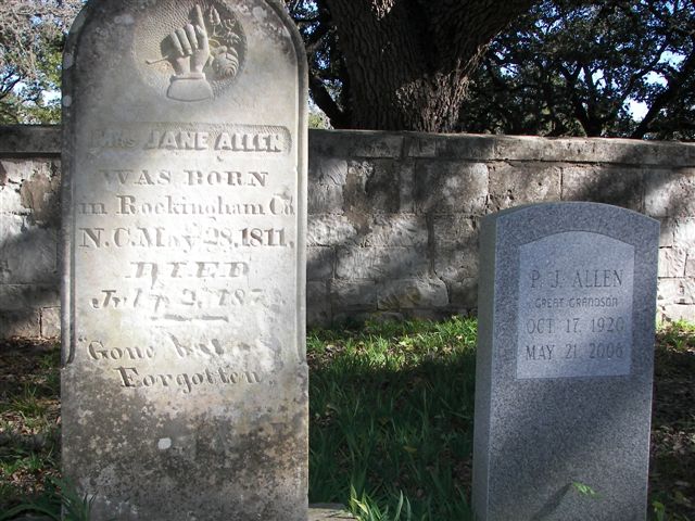 There is a large crypt made of concrete and large rocks which stands approximately two feet tall, three to four feet wide, and eight feet long marking a grave which has no identification on it. Who is buried there was unknown when our first printing was published. We have since learned from Mrs. Tell E. Hat lock, Jr. of Austin that this crypt contains the remains of a John C. Hayes.